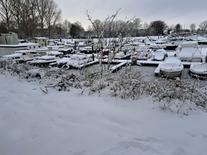Sinds een paar dagen ligt de haven dicht en alle boten onder een dikke laag sneeuw.